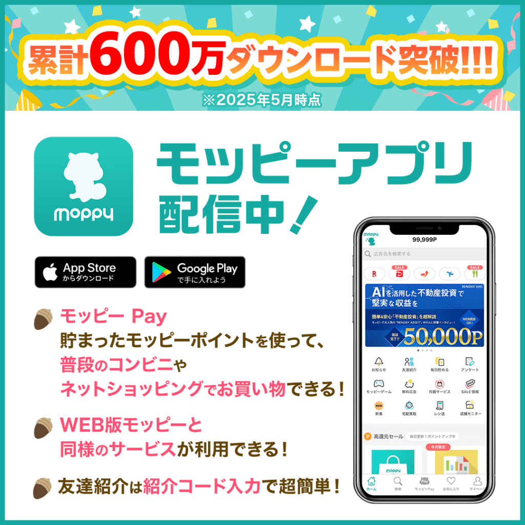 モッピーは、ポイントを貯めることで現金や電子マネーに交換できる人気のポイントサイトです。